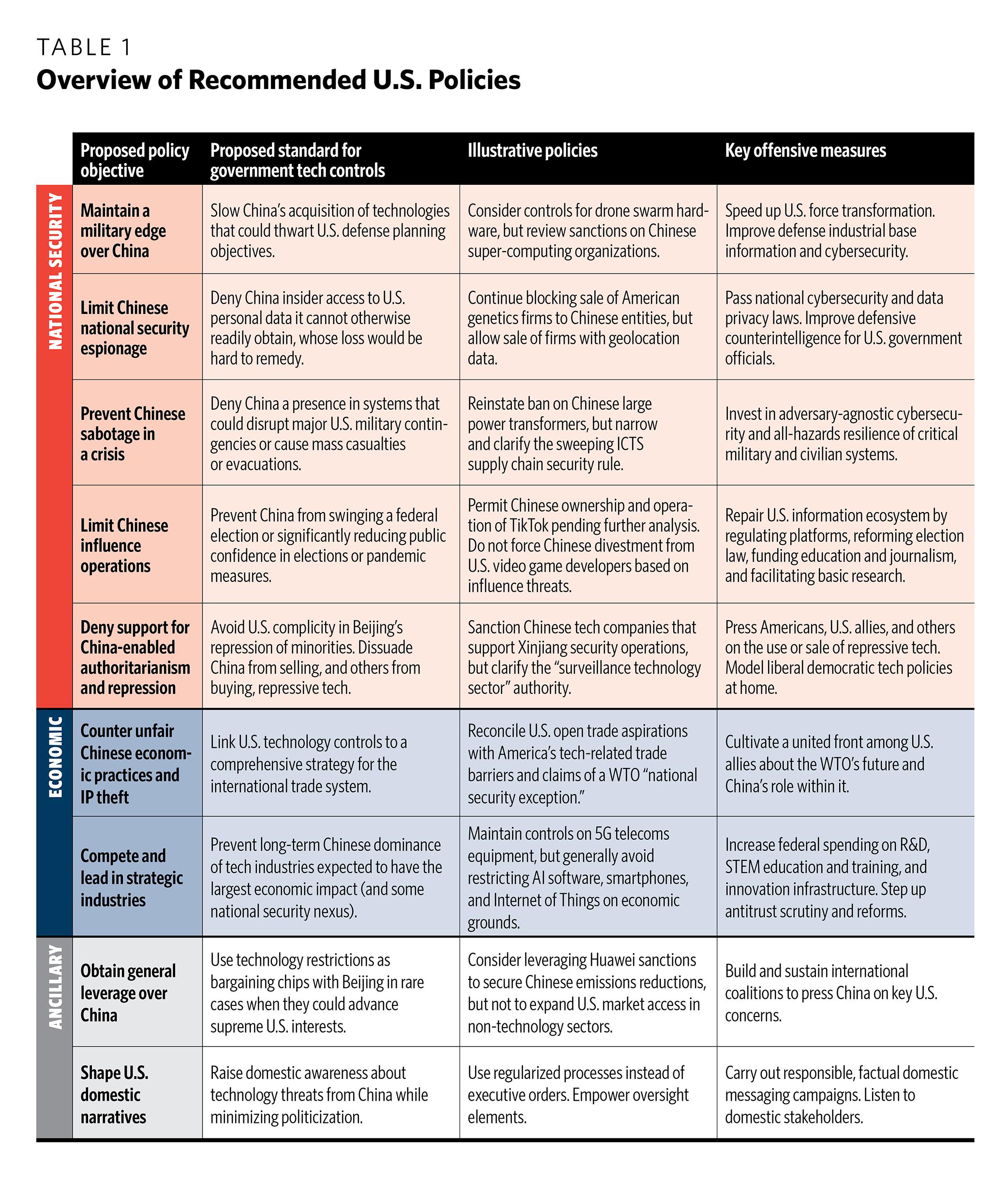 This step-by-step process demonstrates several points that bolster the case for a centrist approach. First, the most strategically significant technologies (like 5G telecommunications equipment and semiconductors) are few in number and already subject to strong U.S. government controls. A handful of other technology areas may need tighter China-oriented restrictions—for example, drone swarms, the U.S. bulk power system, and technologies sold to Xinjiang. Yet certain China-focused controls seem counterproductive in a number of other high-profile areas, such as geolocation data, social media platforms, and consumer devices like smartphones. Second, official U.S. policy goals remain dangerously vague and open-ended. To avoid costly and quixotic technology wars, Washington must publicly clarify its vision for the global tech trade and set more achievable ambitions for countering techno-authoritarianism, maintaining a military edge over China, and preventing Chinese espionage, sabotage, and influence operations. Third, offensive policies have the greatest long-term potential for strengthening U.S. technology leadership, competitiveness, and resilience—and thereby achieving security and prosperity. Although technology restrictions are the primary subject of this report, they cannot be the primary focus of policymakers.