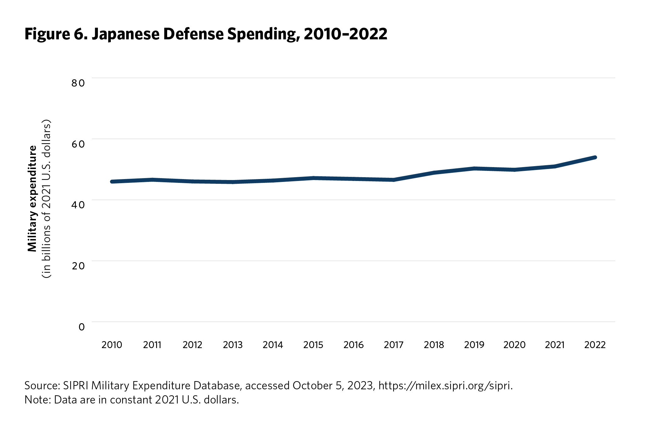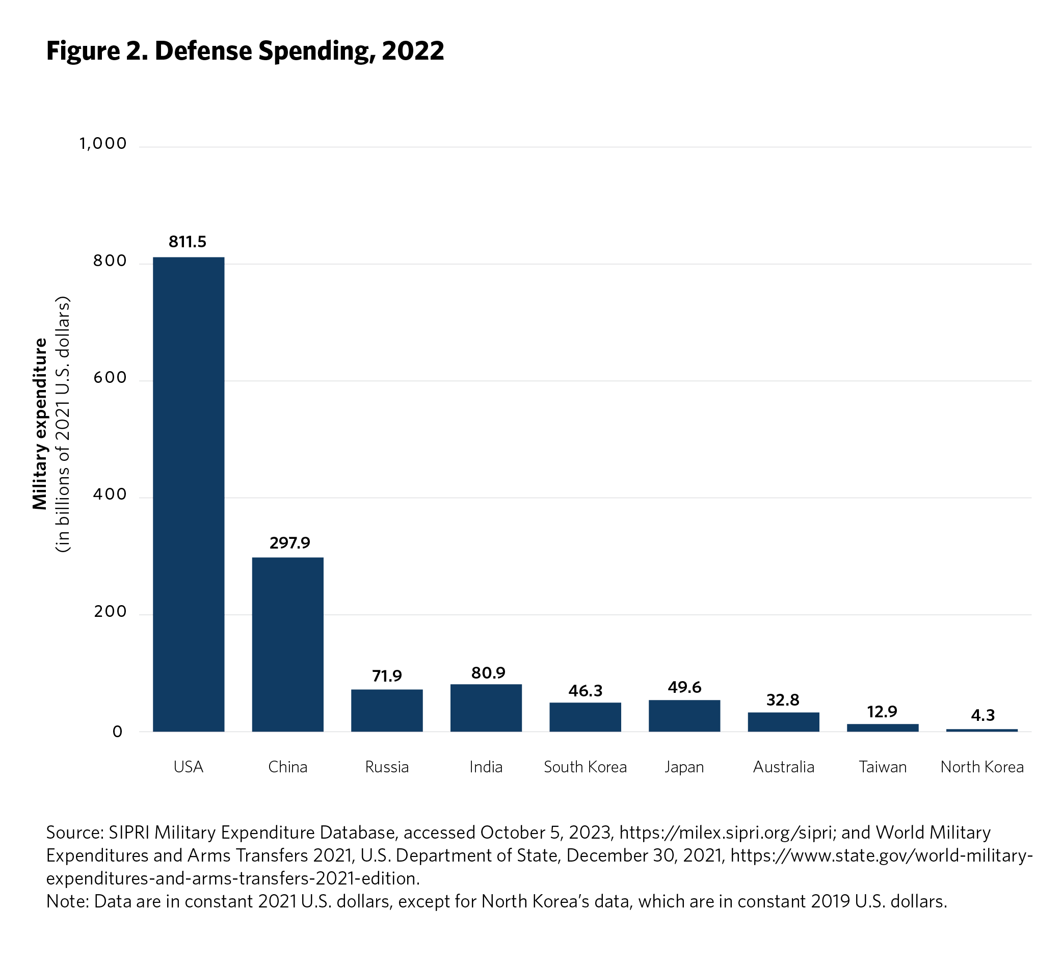 5 Ken Moriyasu, “‘Geopolitical Powder Keg’ Asia Jacks Up Global Military Spending,” Nikkei Asia, August 25, 2022, https://asia.nikkei.com/Politics/International-relations/Indo-Pacific/Geopolitical-powder-keg-Asia-jacks-up-global-military-spending . Time series data on regional defense spending is available from the SIPRI Military Expenditure Database, Stockholm International Peace Research Institute, accessed September 2023, https://www.sipri.org/databases/milex.
